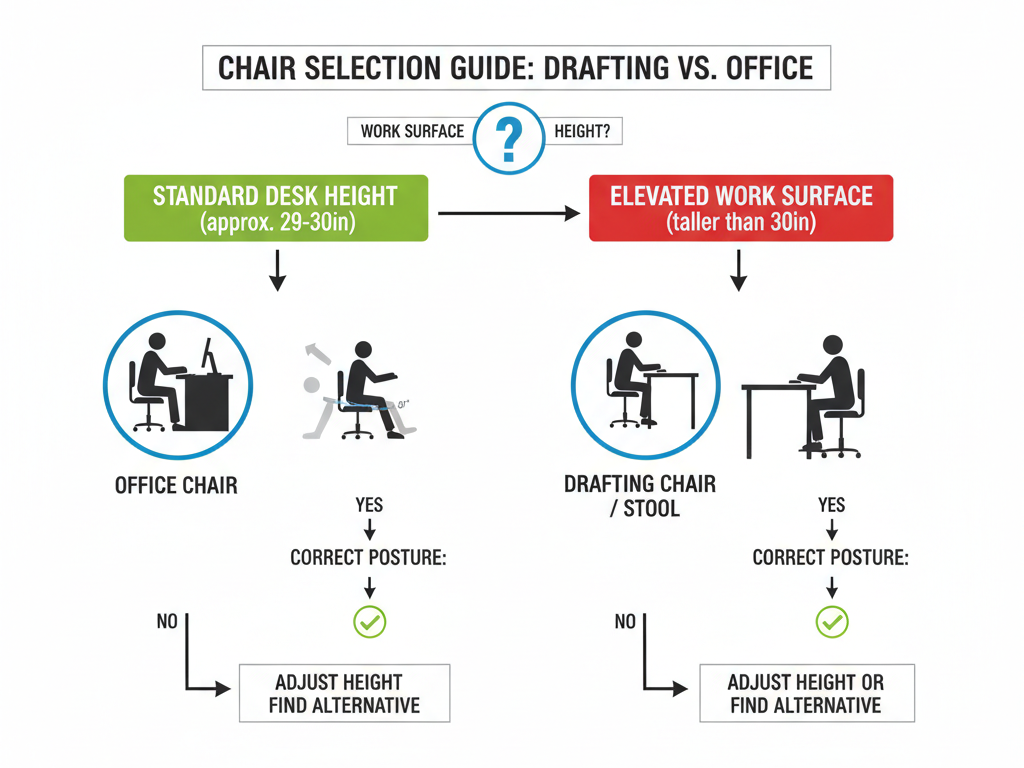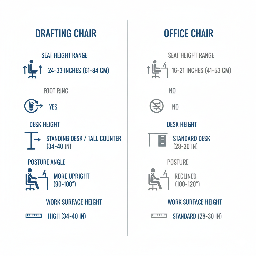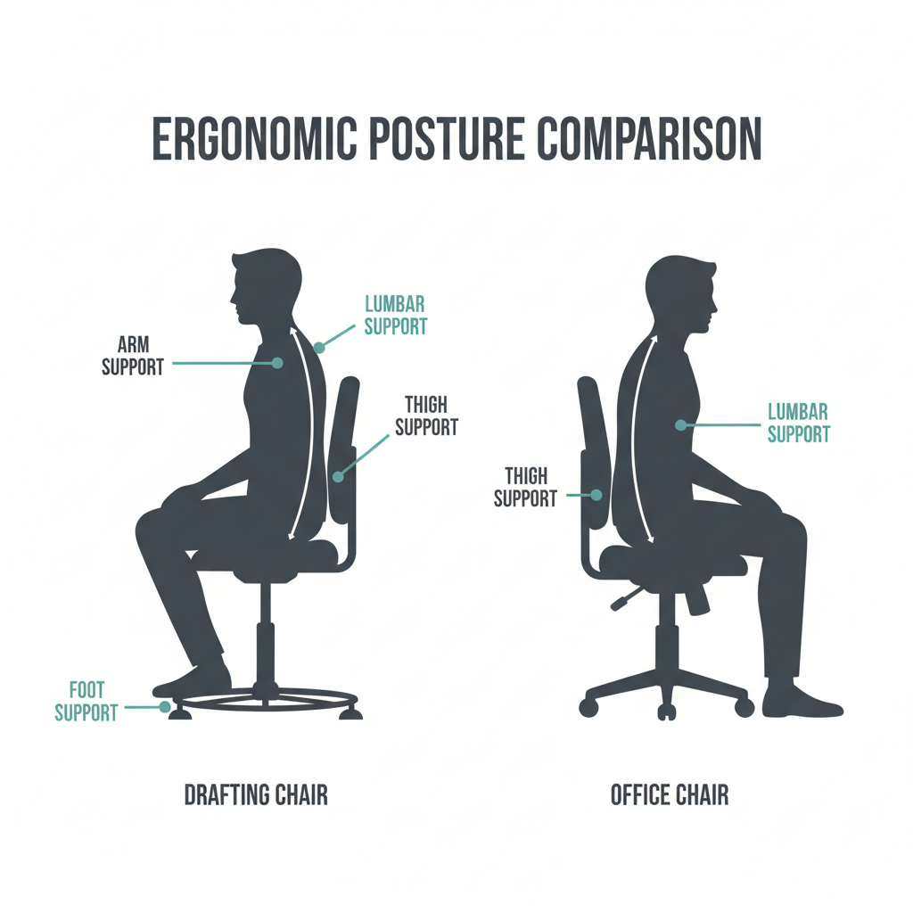 Drafting chairs are designed for elevated work surfaces. Office chairs are designed for standard desk height. Choosing the wrong one usually leads to poor posture, unstable foot support, or unnecessary fatigue.